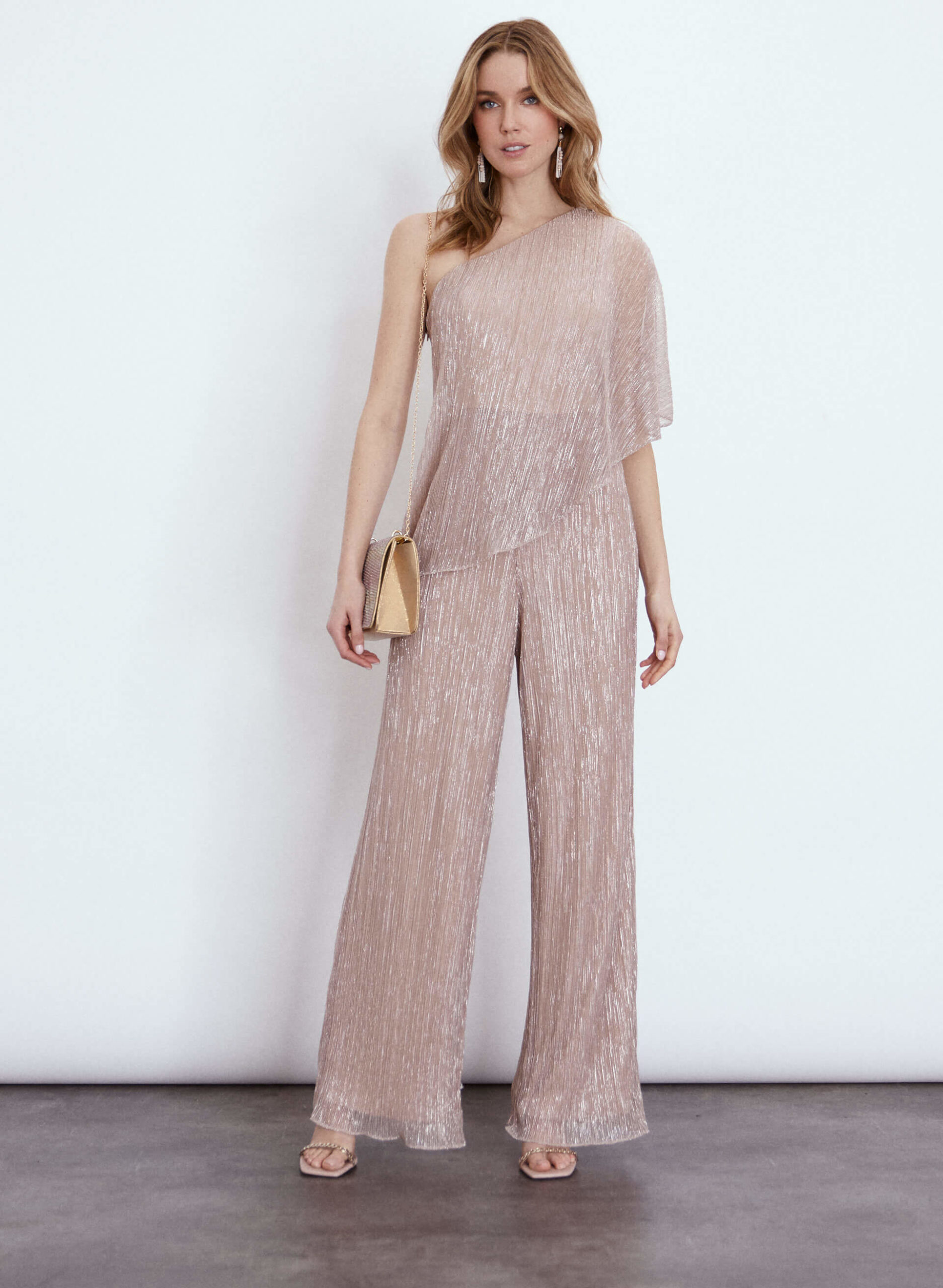 Don’t feel very comfortable in a dress? Opt for a one-piece jumpsuit that is both simple and distinguished, like this shiny metallic style, featuring an asymmetrical bodice and bare-shoulder design. Add an evening clutch, and voilà! Otherwise, other options are available to you, like a three-piece set combining a bead detail top, wide-leg pants and a flowing chiffon jacket.