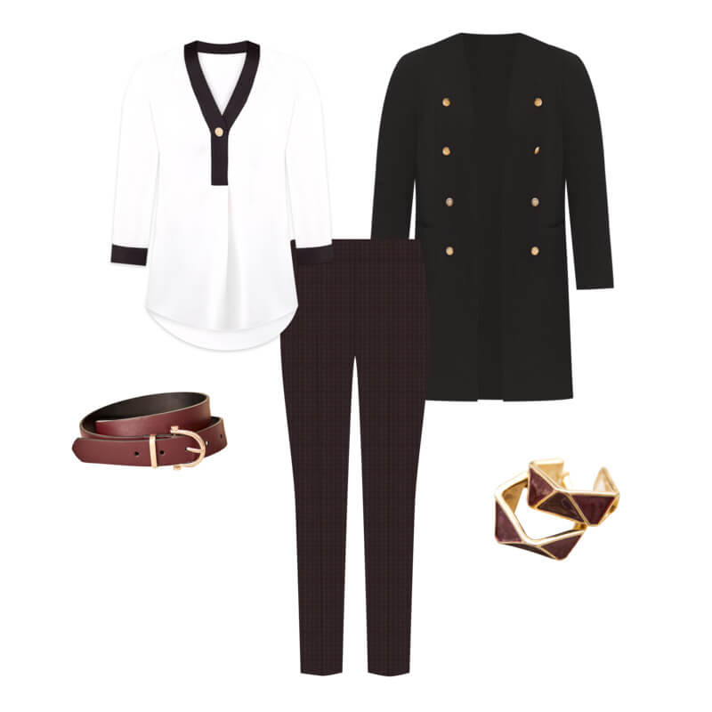 Votre journée se termine dans un restaurant chic de la ville? Troquez le haut basique et le cardigan pour une blouse vaporeuse et un cardigan d’inspiration militaire. Soulignez votre taille avec une ceinture à boucle dorée et ajoutez à votre look des boucles d’oreilles à facettes. Relevez vos cheveux en un élégant chignon et illuminez vos lèvres d’une couleur vive, pour un parfait maquillage de soirée.