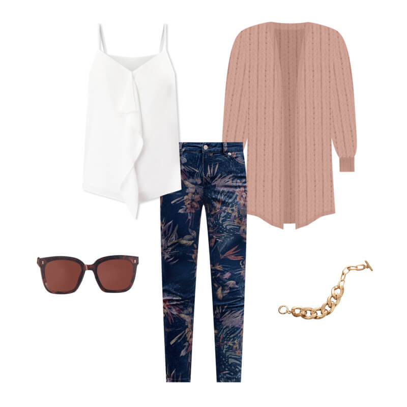 La soirée venue, voici le moment de vous attabler pour un souper en famille détendu. Permettez-vous d’être plus audacieuse en enfilant un jean à motif floral et un cardigan en tricot de couleur vive. Marquez votre poignet avec un bracelet doré à larges maillons. Détachez vos cheveux pour un effet naturel et vous voilà prête à partager un savoureux repas avec vos proches!